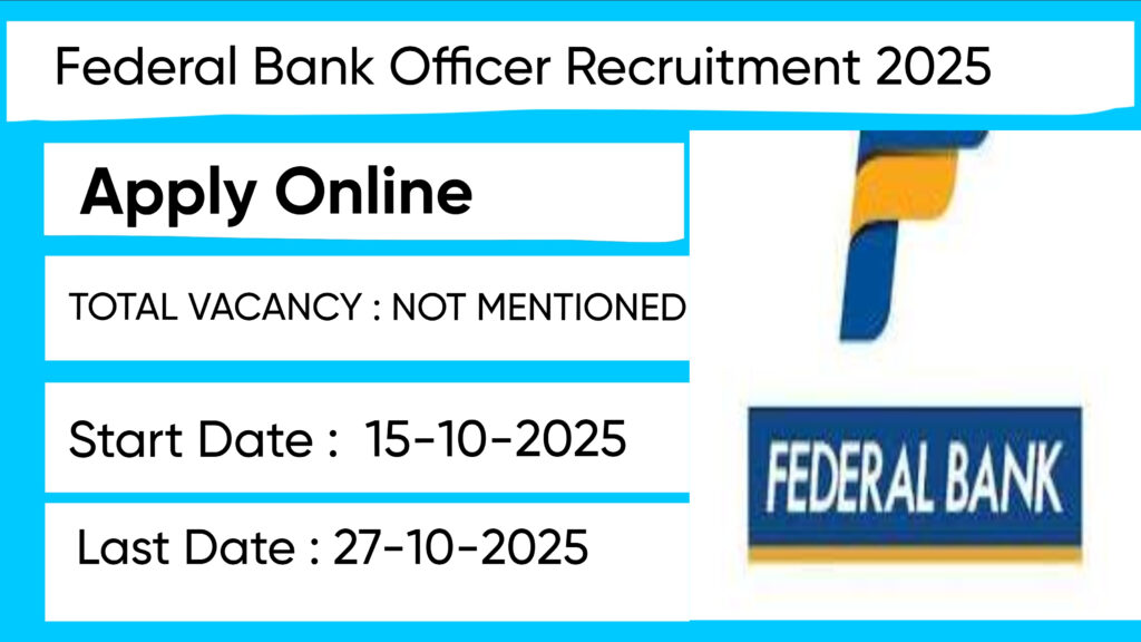 Federal Bank invites applications for Officer posts. Apply online from 15 Oct to 27 Oct 2025. Eligibility: Post Graduate. Official Website: federalbank.co.in. Federal Bank has released an official notification for the recruitment of Officer Posts. Interested and eligible candidates can apply Online through the official Federal Bank website. The last date to submit the application form is 27-10-2025. In this article, you’ll find the Federal Bank Officer Posts recruitment details, including eligibility criteria, age limit, salary structure, selection process, application steps, and direct links to the official notification and Online application form.