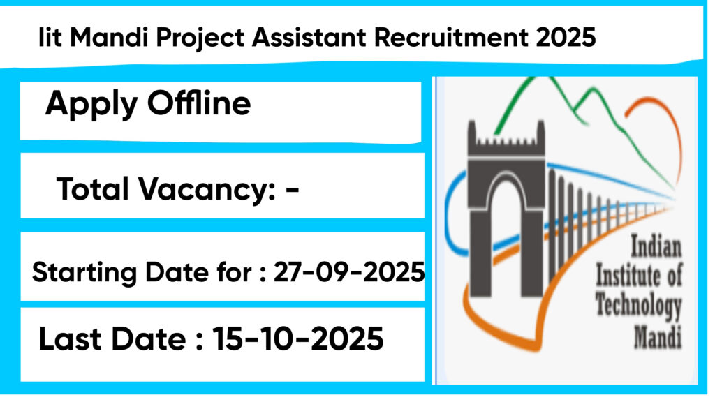 IIT Mandi Recruitment 2025 – Offline applications invited for IIT Mandi Project Assistant Recruitment 2025. Eligible B.E./B.Tech, B.Sc can apply by 15th October at iitmandi.ac.in. indian Institute of Technology Mandi (IIT Mandi)  has released an official notification for the recruitment of Project Assistant Posts. Interested and eligible candidates can apply Offline through the official IIT Mandi website. The last date to submit the application form is 15-10-2025. In this article, you’ll find the IIT Mandi Project Assistant Posts recruitment details, including eligibility criteria, age limit, salary structure, selection process, application steps, and direct links to the official notification and Offline application form.