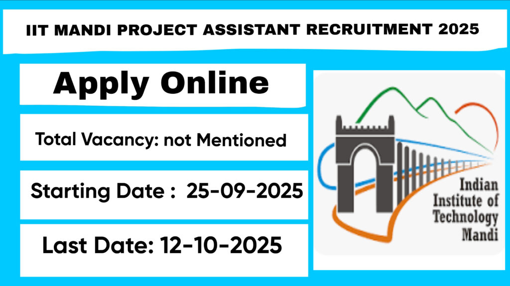 The Indian Institute of Technology Mandi (IIT Mandi) Recruitment 2025 for posts of Project Assistant. Candidates with B.Tech/B.E, M.Sc Can Apply Online. The online application opens on 25-09-2025, and closes on 12-10-2025. The candidate shall apply online through IIT Mandi website, iitmandi.ac.in.
