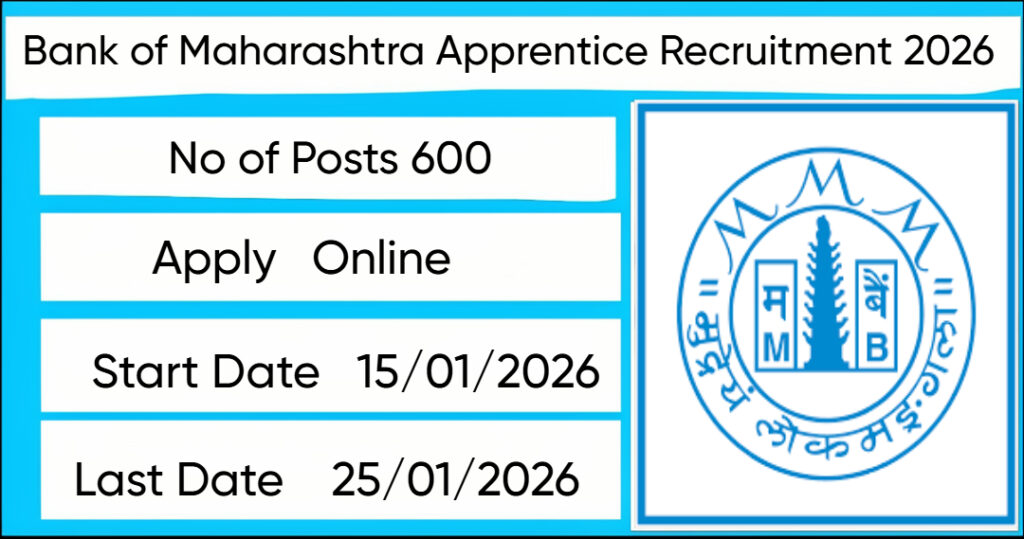 The Bank of Maharashtra Recruitment 2026 for posts of 600 Apprentice. Candidates with Bachelor’s degree Can Apply Online. The online application opens on 15-01-2026, and closes on 25-01-2026. The candidate shall apply online through Bank of Maharashtra website, bankofmaharashtra.bank.in.