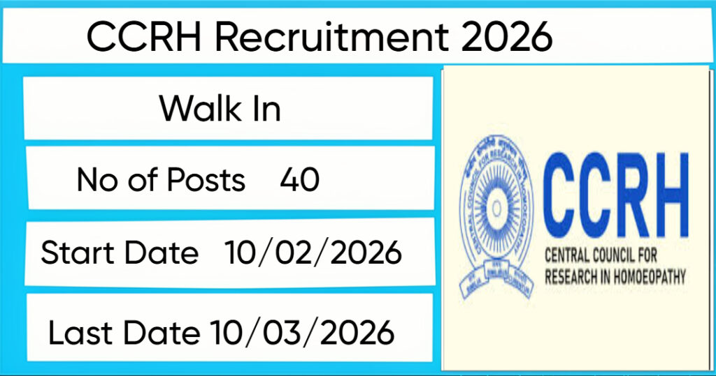 Central Council for Research in Homoeopathy (CCRH) Recruitment 2026 for 40 posts of MTS, Office Assistant and More. Candidates with Any Bachelors Degree, Any Masters Degree, M.Pharma, M.Sc, MVSC, MLT Can attend the walkin. The Walk-in starts from 10-02-2026, and ends on 17-03-2026. For detailed information please visit CCRH official website, https://ccrhindia.ayush.gov.in.