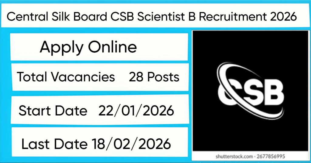 The Central Silk Board (CSB) Recruitment 2026 for posts of 28 Scientist B. Candidates with B.Tech/B.E Can Apply Online. The online application opens on 19-01-2026, and closes on 18-02-2026. The candidate shall apply online through CSB website, csb.gov.in