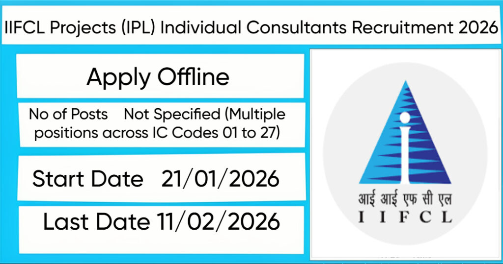 IIFCL Projects (IPL)  has released an official notification for the recruitment of Not Mentioned Individual Consultants Posts. Interested and eligible candidates can apply Offline through the official IPL website. The last date to submit the application form is 11-02-2026. In this article, you’ll find the IPL Individual Consultants Posts recruitment details, including eligibility criteria, age limit, salary structure, selection process, application steps, and direct links to the official notification and Offline application form.