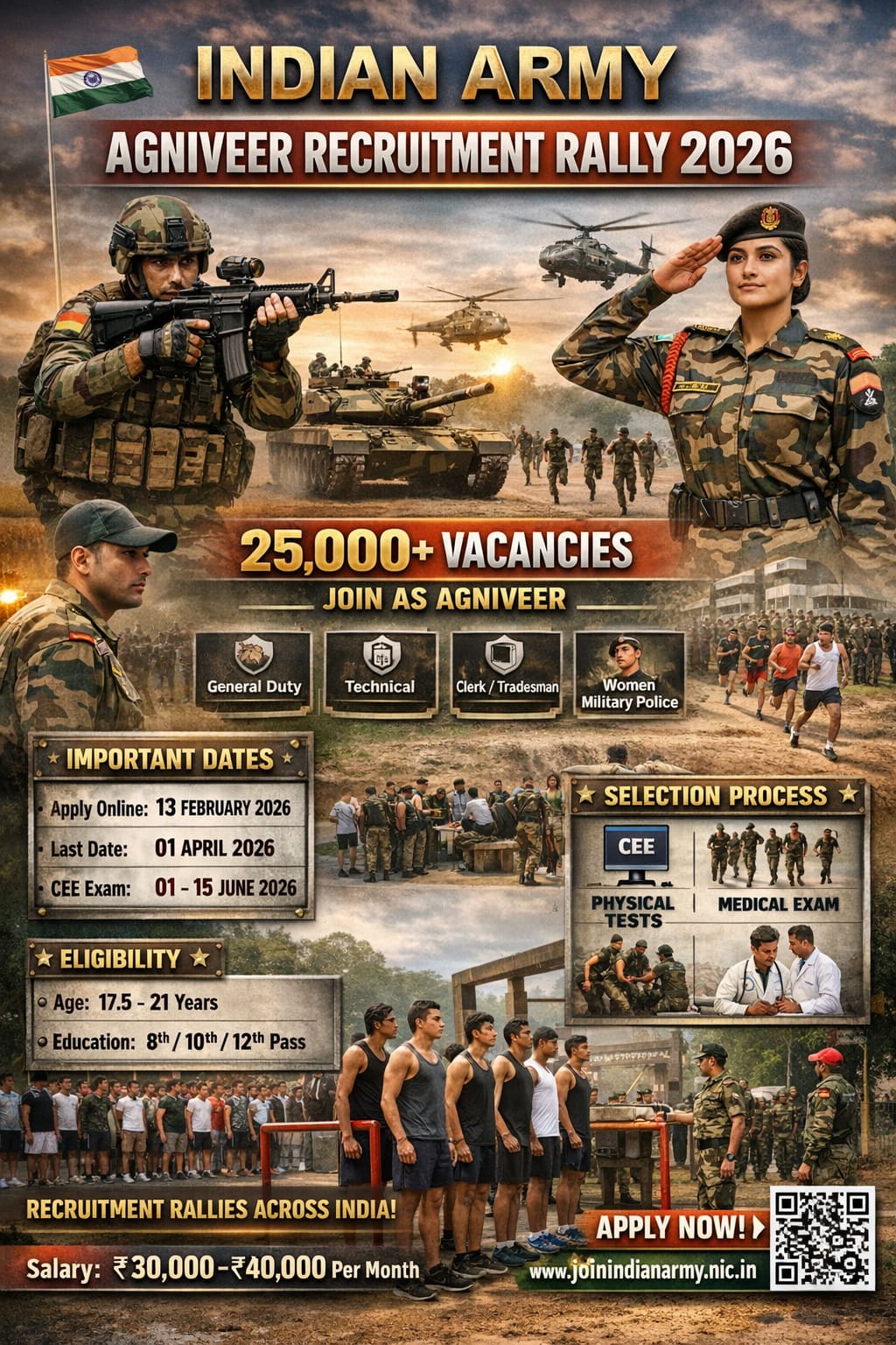 The Indian ArmyRecruitment 2026 for posts of Agniveer. Candidates with 12Th, 10Th, 8Th Can Apply Online. The online application closes on 01-04-2026. The candidates shall apply online through Indian Army website, joinindianarmy.nic.in.