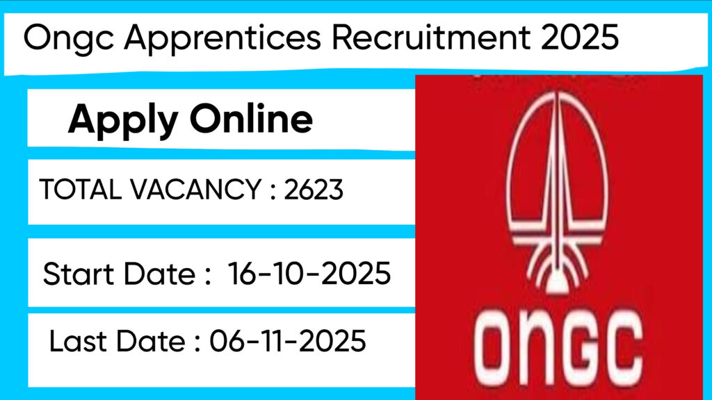 Oil and Natural Gas Corporation (ONGC) invites applications for 2623 Apprentices posts. Apply online from 16 Oct to 06 Nov 2025. Eligibility: Graduate, B.Com, B.Sc, Diploma, ITI, 10TH. Official Website: ongcindia.com. Oil and Natural Gas Corporation (ONGC) has released an official notification for the recruitment of 2623 Apprentices Posts. Interested and eligible candidates can apply Online through the official ONGC website. The last date to submit the application form is 06-11-2025. In this article, you’ll find the ONGC Apprentices Posts recruitment details, including eligibility criteria, age limit, salary structure, selection process, application steps, and direct links to the official notification and Online application form.