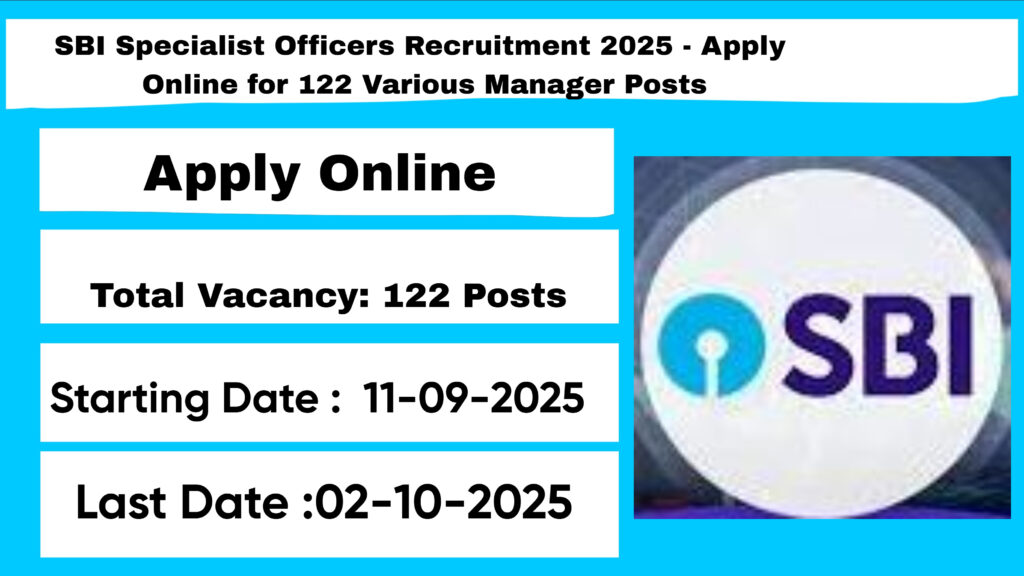 The State Bank of India (SBI) Recruitment 2025 for 122 posts of Specialist Officers. Candidates with Any Graduate, B.Tech/B.E, CA, ICWA, MBA/PGDM, MCA, PGDBM, PGDBA Can Apply Online. The online application opens on 11-09-2025, and closes on 02-10-2025. The candidate shall apply online through SBI website, sbi.bank.in.