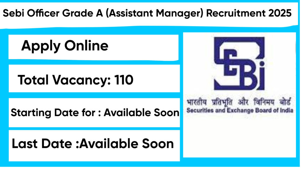 The Securities and Exchange Board of India (SEBI) Recruitment 2025 for 110 posts of Officer Grade A (Assistant Manager). Candidates with B.A, B.Tech/B.E, Any Masters Degree, PG Diploma Can Apply Online. The candidate shall apply online through SEBI website, sebi.gov.in Securities and Exchange Board of India (SEBI) has released an official notification for the recruitment of 110 Officer Grade A (Assistant Manager) Posts. Interested and eligible candidates can apply Online through the official SEBI website. The last date to submit the application form is updated Soon. In this article, you’ll find the SEBI Officer Grade A (Assistant Manager) Posts recruitment details, including eligibility criteria, age limit, salary structure, selection process, application steps, and direct links to the official notification and Online application form.