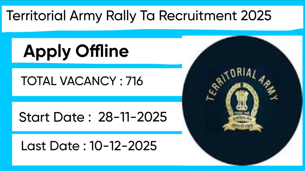 Territorial Army invites applications for 716 Soldier posts. Apply Offline from 28 Nov to 10 Dec 2025. Eligibility: 10TH. Official Website: territorialarmy.in Territorial Army has released an official notification for the recruitment of 716 Soldier Posts. Interested and eligible candidates can apply Offline through the official Territorial Army website. The last date to submit the application form is 10-12-2025. In this article, you’ll find the Territorial Army Soldier Posts recruitment details, including eligibility criteria, age limit, salary structure, selection process, application steps, and direct links to the official notification and Offline application form.