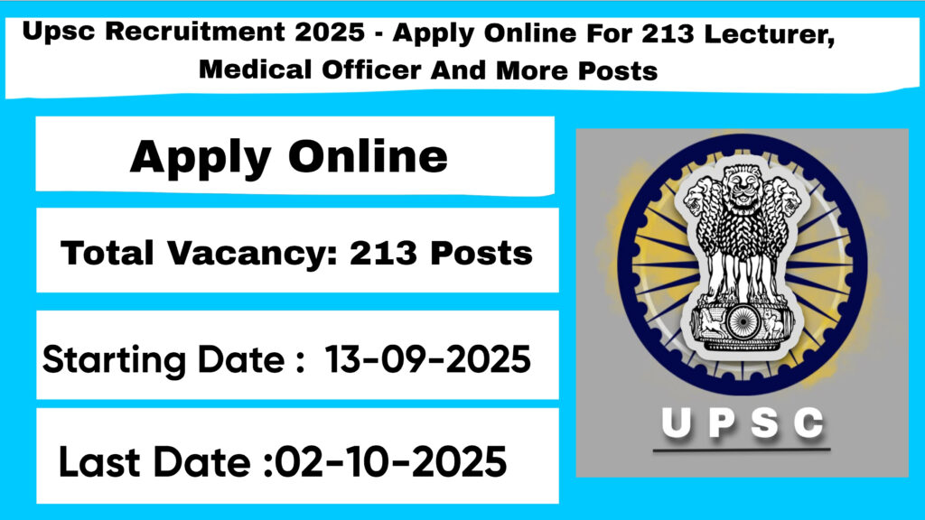 The Union Public Service Commission (UPSC) Recruitment 2025 for 213 posts of Lecturer, Medical Officer and More. Candidates with LLB, MBBS Can Apply Online. The online application opens on 13-09-2025, and closes on 02-10-2025. The candidate shall apply online through UPSC website, upsc.gov.in.